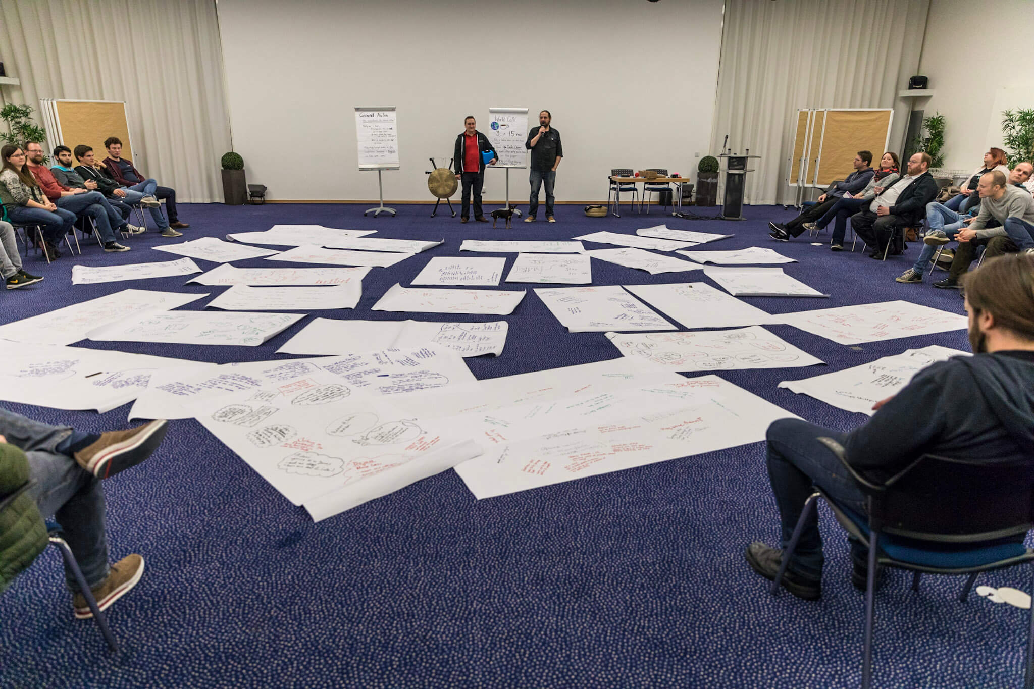 Lean coffee is a lightweight moderation technique which allows time-efficient meetings with no prepared agenda but deeply satisfying and tangible action items as results. The participants compile and prioritize the agenda during the meeting itself and use thumb-voting to extend or limit the timebox for discussion. So interaction is again crucial for this format. We already tried it in VR, it works surprisingly well!