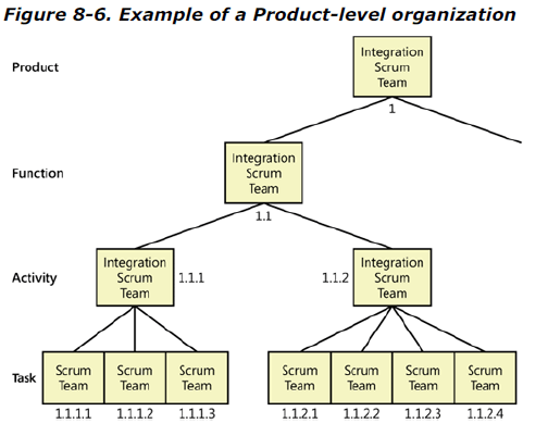 Die Strategie von Schwaber für eine Skalierung sieht vor, dass der Start mit Scrum mit einem Team erfolgt. Wenn neue Scrum Teams hinzugefügt werden, soll ein Teammitglied des bisherigen Teams (d.h. in der Abbildung aus 1) in die neuen Teams (1.1 bis 1.3) wandern. Das bisherige Scrum Team wird nun zum Integration Scrum Team und ist für die erfolgreiche Integration der Arbeit der anderen Teams in ein qualitativ hochwertiges Produkt verantwortlich. Dazu entwirft das Integration Scrum Team eine tragfähige Architektur, die Coding-Standards und verantwortet weitere notwendige Dinge die natürlich jeweils von dem Produkt abhängig sind.