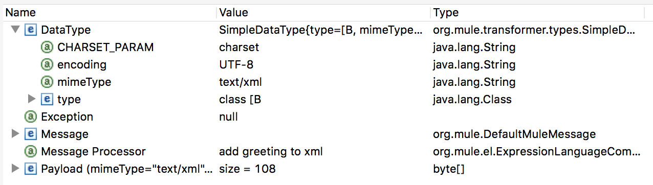 Wenn man genau hinguckt, fällt einem im Debugger das Element „DataType“ auf. Dieser zeigt Details zur aktuellen Payload an. In unserem Fall ist der Value ein SimpleDataType, der neben der Klasse java.lang.String auch Informationen zum Encoding und MIME-Type enthält. Diese Informationen wurden vom Endpoint aus den geschickten Daten gewonnen. Ich habe zum Beispiel im Postman beim Senden des POST-Requests als Datentyp application/xml angegeben. Diese Informationen waren übrigens auch schon für den Stream vorhanden.