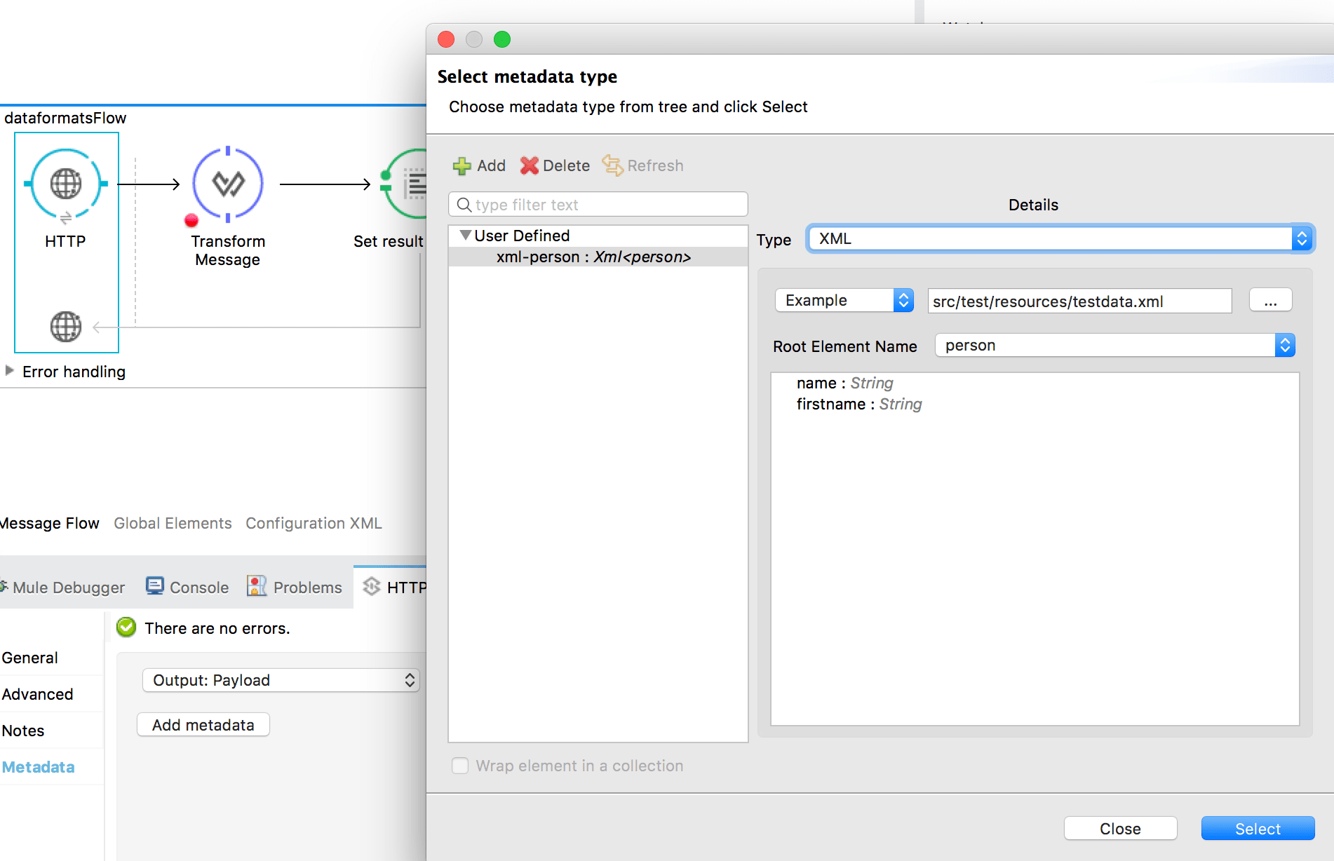 In der XML-Configuration wird am Endpoint ein Attribut für Metadaten ergänzt, welches ich den Beispielen hier nicht aufführe. Die ID der Metadaten ist ein zufällig generierter Wert, der selber keine Aussagekraft hat, aber auf einen Typ verweist, der in den Projekt-Metadaten verwaltet wird. Diese wiederum können über das Projekt-Kontextmenü Mule/Manage Metadata Types verwaltet werden.