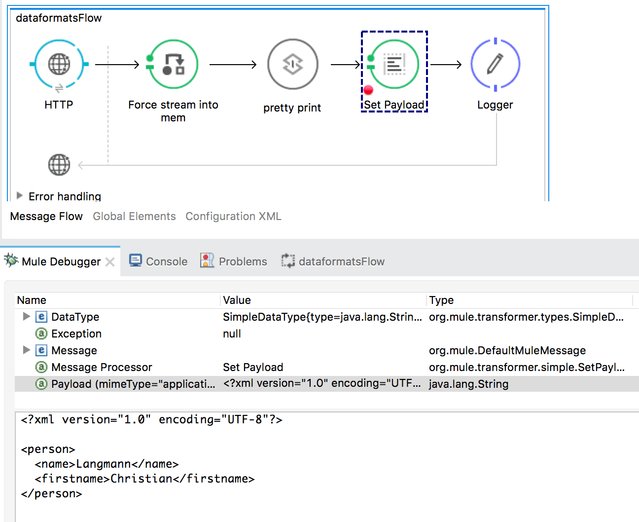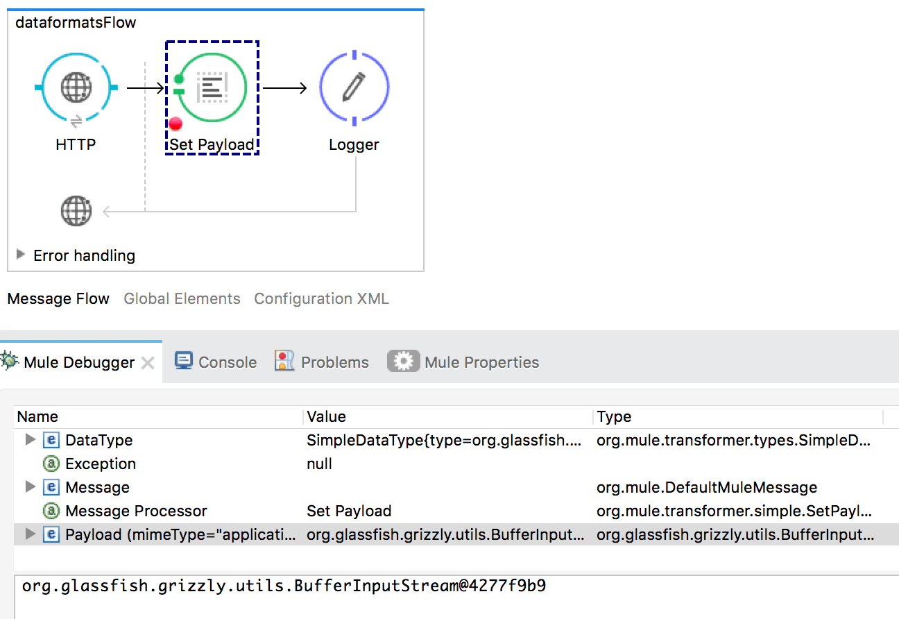 Gerade für Neulinge können die Datenformate in Mule sehr verwirrend sein: Man bekommt aus einer Queue laut Dokumentation ein XML, klickt daraufhin seinen Flow zusammen, versucht mit den Daten zu arbeiten, stellt aber schnell fest: Es ist gar nicht so einfach. Man bekommt Exceptions, Datentypen stimmen nicht oder MEL-Ausdrücke sind falsch. Dann schmeißt man den Debugger an logged was das Zeug hält. Und sieht? Mal Strings, mal Streams, mal Byte-Arrays.