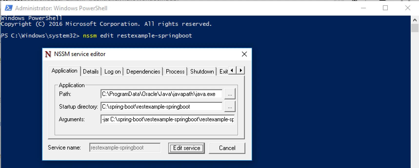 Dies tun wir im nächsten Schritt. Die nssm Service Option AppDirectory kann sehr wichtig sein, falls die Spring Boot Anwendung native Bibliotheken wie z.B. dll-Dateien im selben Verzeichnis erwartet, in dem sie läuft. Diese nssm Option kann manuell auf der Kommandozeile per nssm edit servicename konfiguriert werden. Der Befehl öffnet daraufhin einen Konfigurationsdialog: