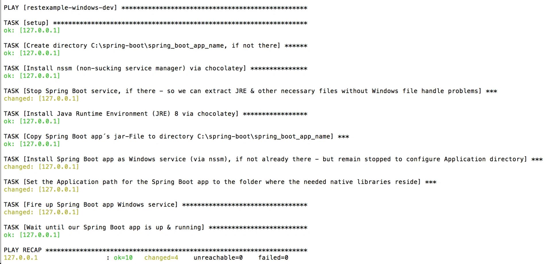 1ansible-playbook -i hostsfile restexample-windows.yml --extra-vars "spring_boot_app_jar=../restexamples/target/restexamples-0.0.1-SNAPSHOT.jar spring_boot_app_name=restexample-springboot host=restexample-windows-dev"