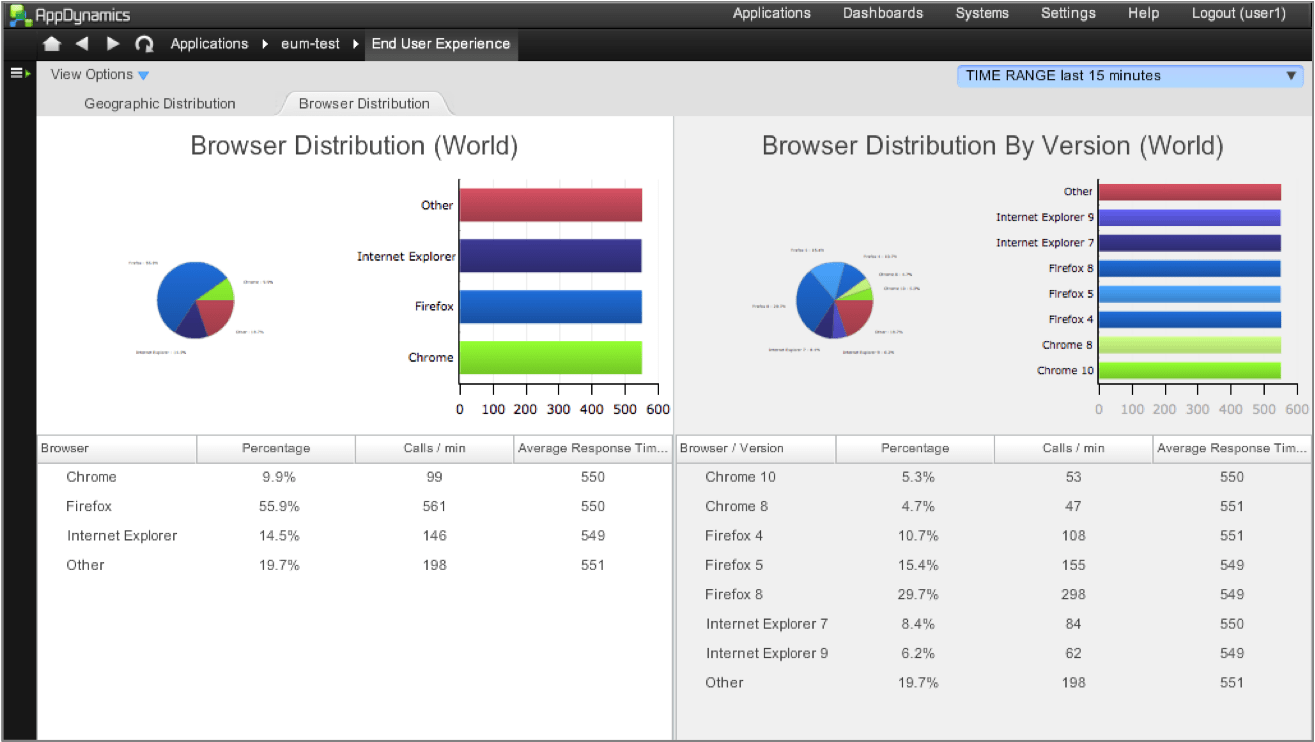 Die EUM Daten werden dann nach Geographie (Land, Bundesland, Stadt) und Browser Verteilung dargestellt.