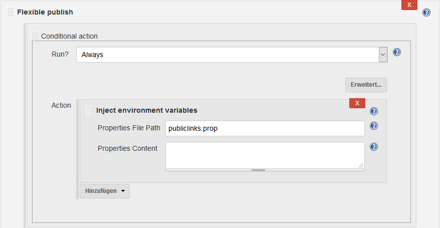 Dazu nutzen wir das Feature „Öffentliche Links als Variable bereitstellen“. Dies erzeugt nach dem Hochladen die nötigen Links und schreibt diese in eine Properties-Datei „publiclinks.prop“. Die Variable heißt dann publiclinks. Mit EnvInject können wir diese Datei laden, um die Variable auch verwenden zu können. Damit dies auch als Post-Build-Schritt klappt, verwenden wir das Flexible Publish Plugin (enthalten im Any Build Step Plugin ).