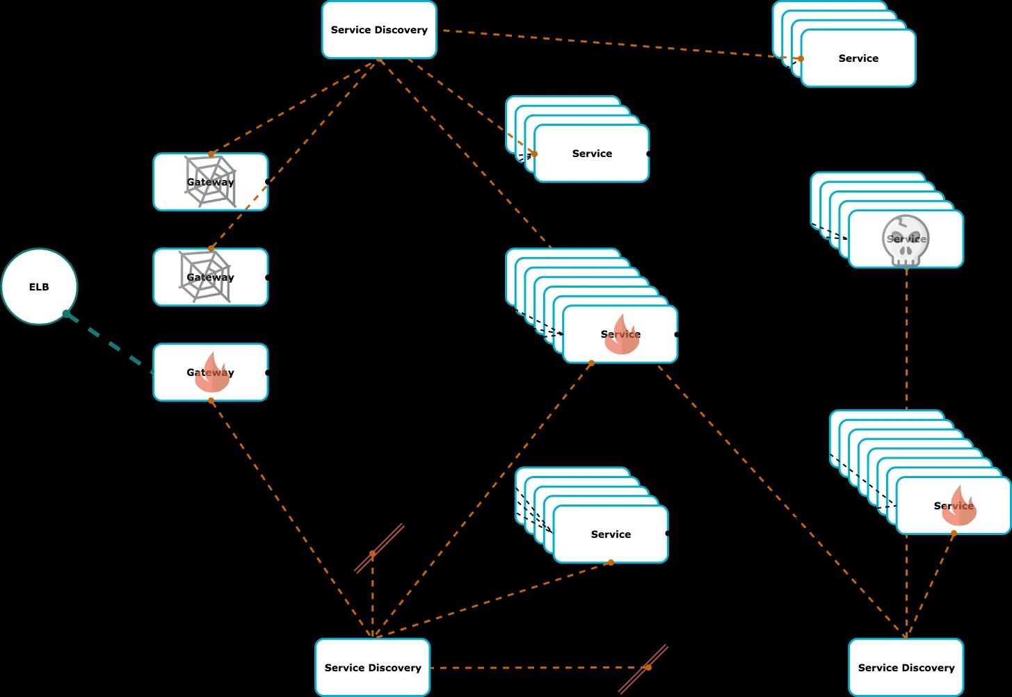 The load balancer doesn’t know all instances of the gateway or cannot reach them in the network due to a firewall rule. Several applications are dead, but service discovery doesn’t notice the failure. Additionally, service discovery can’t synchronize and delivers varying results. The load cannot be distributed due to missing instances, and this leads to an increased load on the individual nodes. And anyway – why does the twelve-hour batch have to run during the day and why does it need twelve hours?!