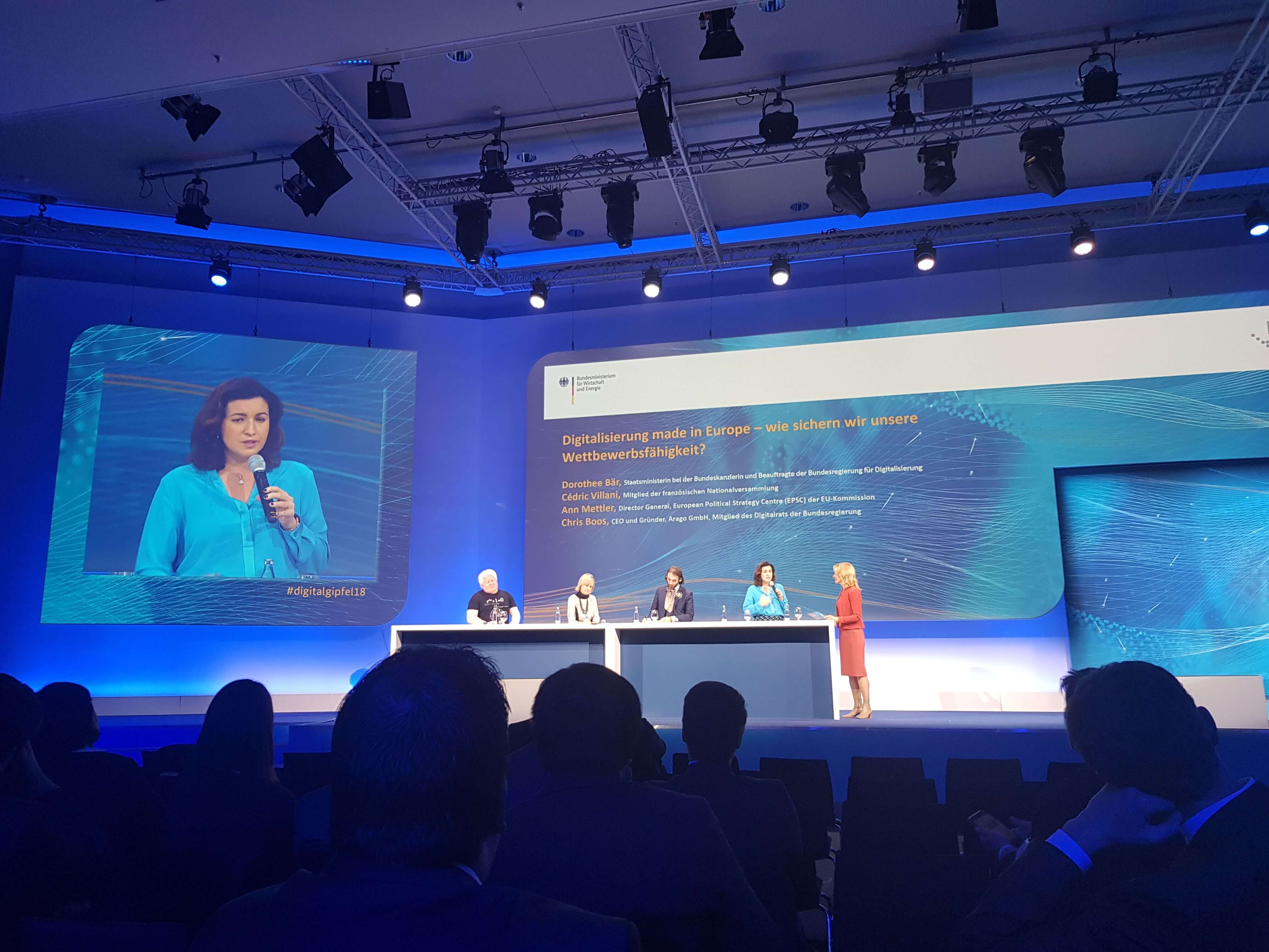 Die Podiumsdiskussion zu Industrie 4.0 konnte überraschenderweise nicht mit viel neuen, konkreten Aspekten dienen. Vielmehr entwickelte sich die Veranstaltung zwischenzeitlich zu einem spontanen Schlagabtausch zwischen Verbänden und Staatssekretären. Zum Schluss versuchten Vertreter der Telekom, mit digitalen Mythen in Bezug auf 5G aufzuräumen, z.B. „5G ist die Basis für Künstliche Intelligenz“ – für das Publikum sicherlich nur teilweise relevant. Wir wissen nun auf jeden Fall, dass die Telekom „jedes Funkloch persönlich kennt“ und dem Bund demnächst einen Stapel hängender Genehmigungsverfahren auf den Tisch legt. Insgesamt zeigen sich die Vertreter der Wirtschaft alle recht besorgt und nervös in Bezug auf die ePrivacy-Verordnung, da diese aus ihrer Sicht die Machine-to-Machine-Kommunikation einschränken und somit den Standort Europa schädigen würde.