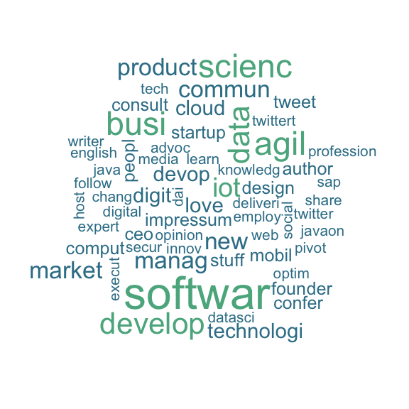 Nicht überraschend finden wir software, development, agil und business unter den häufigsten Wörtern. Aber auch IoT (Internet of Things), data und science werden häufig in den Profilbeschreibungen unserer einflußreichen Follower genannt!