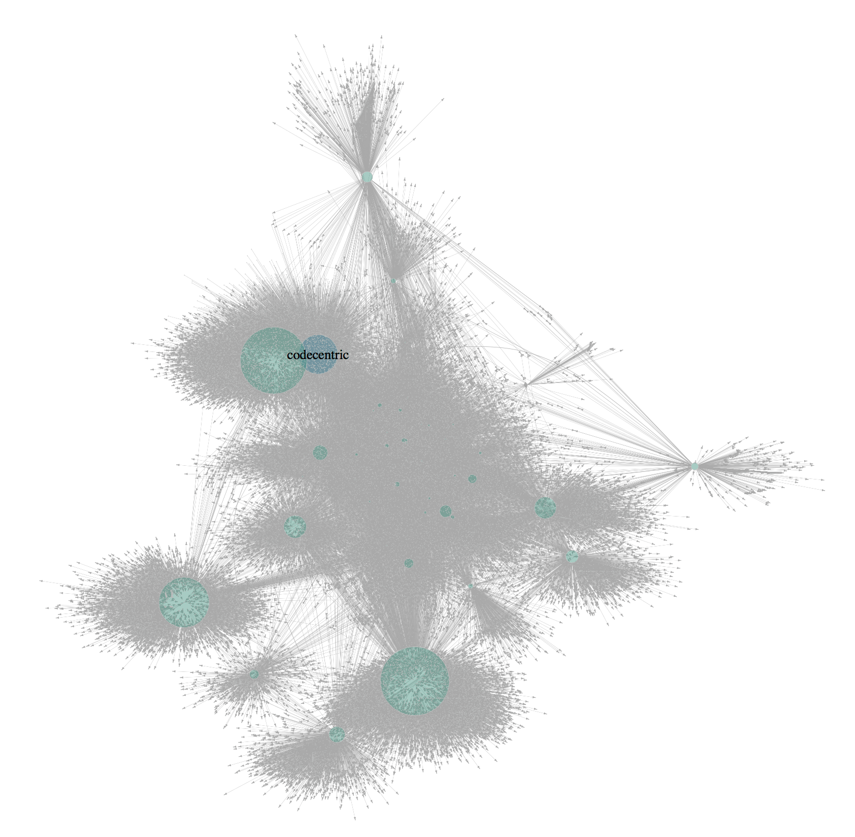 Soziales Netzwerk von codecentric’s Twitter Freunden und Followern. Knotengröße entspricht “betweenness” Zentralität.