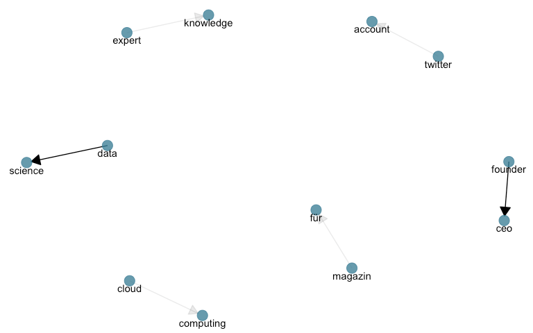 Diese Abbildung zeigt die am häufigsten vorkommenden Wortpaare in den Profilbeschreibungen unserer einflußreichsten Follower. Pfeilfarben entsprechen der Häufigkeit. Da wir nur eine relativ kleine Gruppe an Followern analysieren, kommt keines der Wortpaare extrem häufig vor. Nichtsdestrotz ist “data science” das am meisten vorkommende Wortpaar!