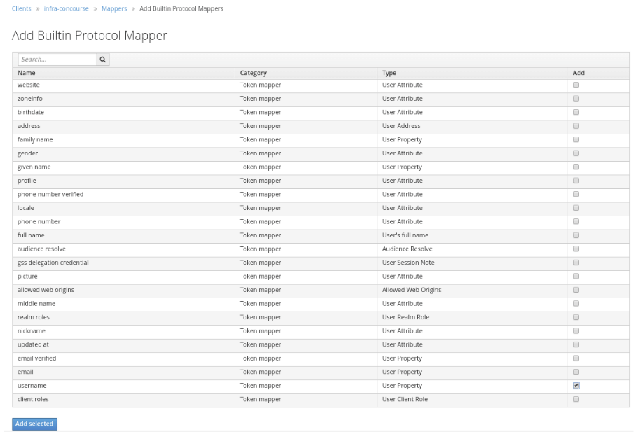 Dazu klicken wir unter dem Punkt mappers auf den Button Add Builtin und wählen den username Mapper aus.