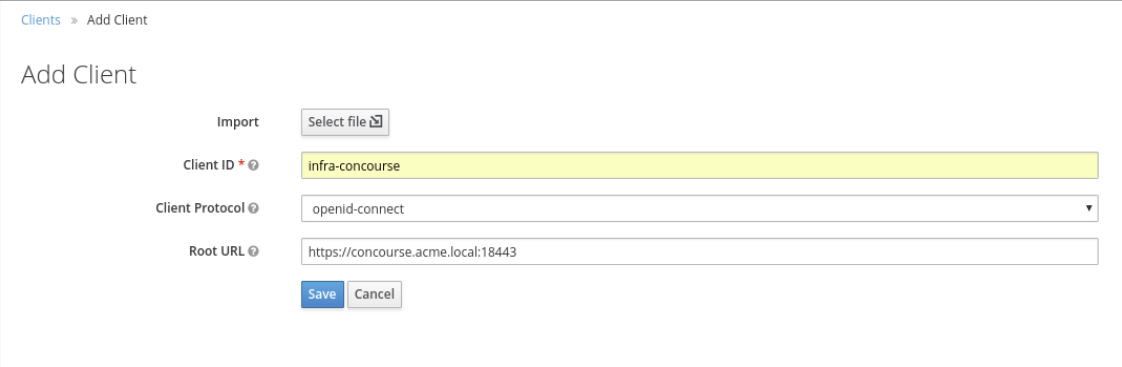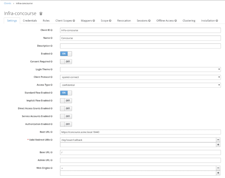 Für die Verbindung mit Concourse CI definieren wir einen OpenID Connect-Client und geben infra-concourse als dessen Client-ID an. Als Root URL verwenden wir https://concourse.acme.local:18443.