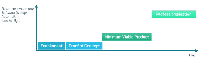 Die Phasen: Enablement, Proof of Concept, Minimum Viable Product und Professionalisation im Verhältnis zum ROI und Zeit