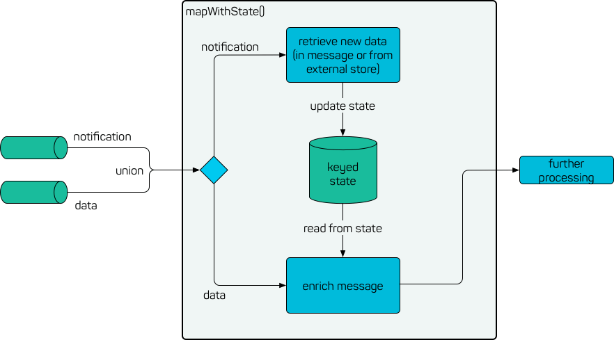 Um den State zu aktualisieren, müssen zusätzliche Notification Events im Stream vorhanden sein. Diese können beispielsweise aus einem separaten Kafka Topic kommen und mit dem eigentlichen Datenstream zusammengeführt werden (union()). Die gesendete Datenmenge kann dabei von einer einfachen Benachrichtigung mit einer ID, die dann für das Lesen der neuen Daten genutzt wird, bis hin zu dem kompletten neuen Datensatz reichen.
