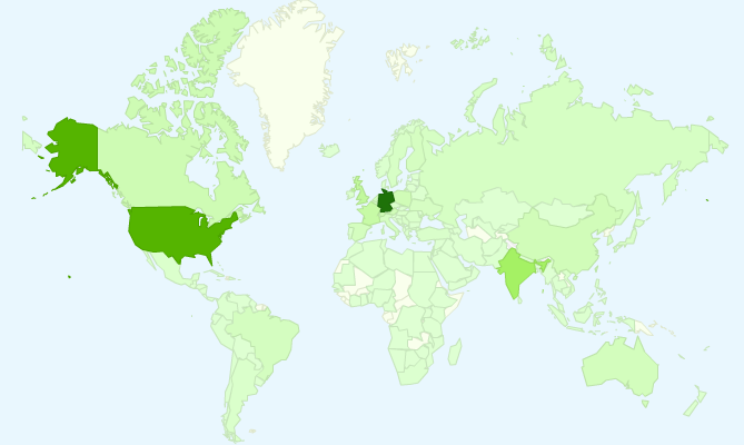 Knapp 50% aller Leser kamen aus dem deutschsprachigen Raum, gefolgt von den USA, Indien und Großbritannien. Nur wenige weiße Flecken auf der Karte sind eindrucksvoller Beweis dafür, dass man über das Internet wirklich die ganze Welt erreichen kann!