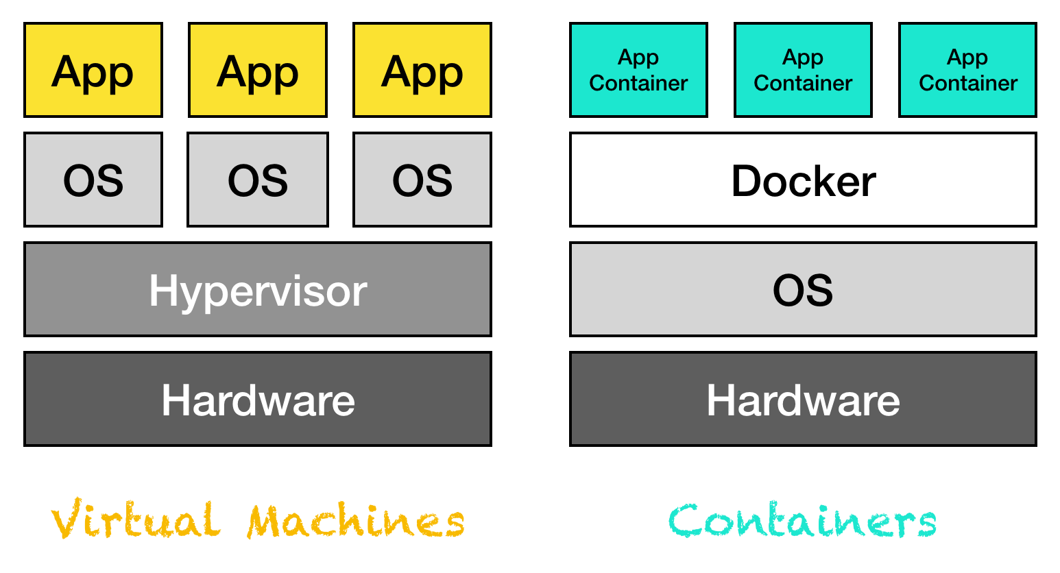 As you can see, the container-based setup has less overhead as it does not require an additional operating system for each application. This is possible because the container manager (e.g. Docker) uses operating system functionality directly to isolate applications in a more lightweight fashion.