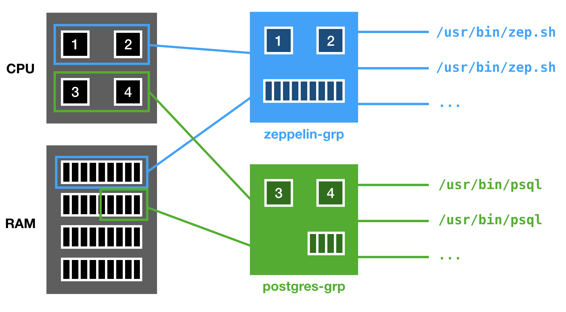 All Zeppelin notebooks started in the zeppelin-grp will utilize only core 1 and 2, while the PostgreSQL processes share core 3 and 4. Same applies to the memory. Cgroups are one important building block in container isolation as they allow hardware resource isolation.