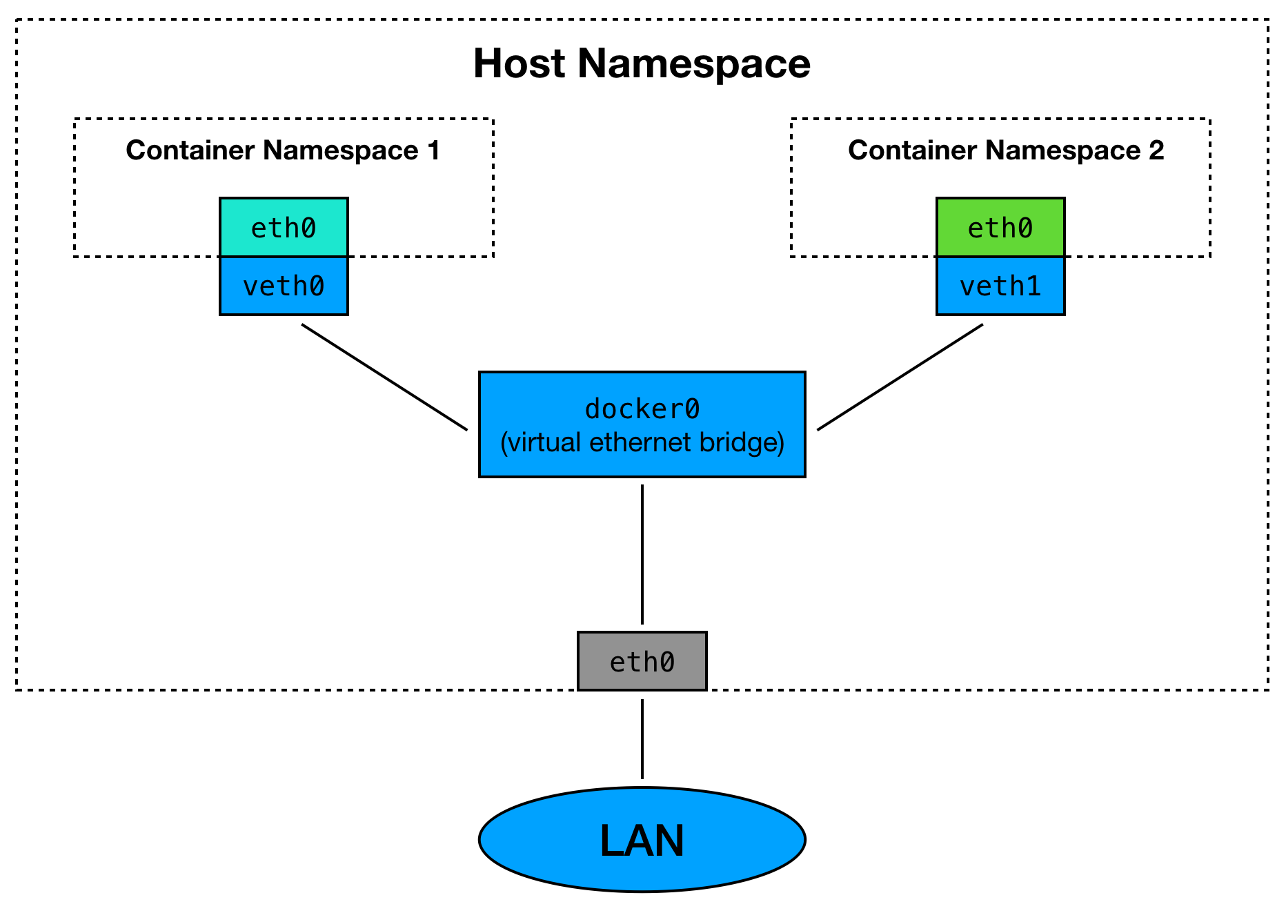 The two containers in this example have their own eth0 network interface inside their network namespace. It is mapped to a corresponding virtual network interface veth0 and veth1 on the Docker host. The virtual network bridge docker0 connects the host network interface eth0 to all container network interfaces.