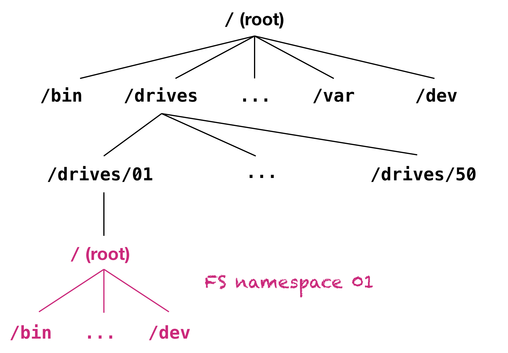 In order to achieve isolation on a filesystem level, the namespace will map a node in the filesystem tree to a virtual root inside that namespace. Browsing the filesystem inside that namespace, Linux does not allow you to go beyond your virtualized root. The following drawing shows part of a filesystem that contains multiple “virtual” filesystem roots inside the /drives/xx folders, each containing different data.