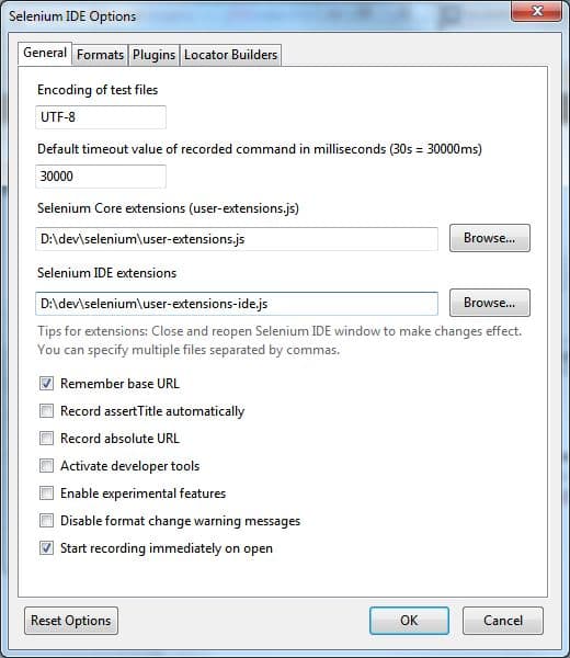 Die obigen Skripte sollten in einer separaten Datei gespeichert werden (z.B. user-extension-ide.js), weil der LocatorBuilder nur in der Selenium IDE benötigt wird.