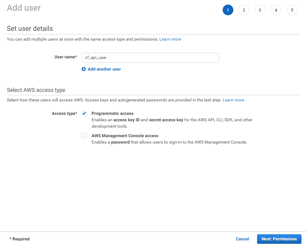 Schritt 1: Benennen Sie den User als „cf_api_user“ und wählen sie „Programmatic access“ aus. Anschließend: „Next: Permissions“