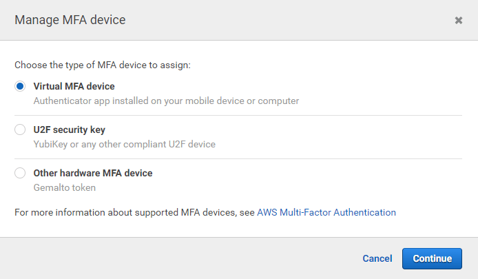 In der Auswahlliste einen der Punkte auswählen. Tipp: Beim „Virtual MFA device“ geht es um den bekannten 6-stelligen Two-Factor Key, der z. B. mit dem Google Authenticator oder Authy generiert werden kann. Wizard Schritt für Schritt durchgehen und abschließen.