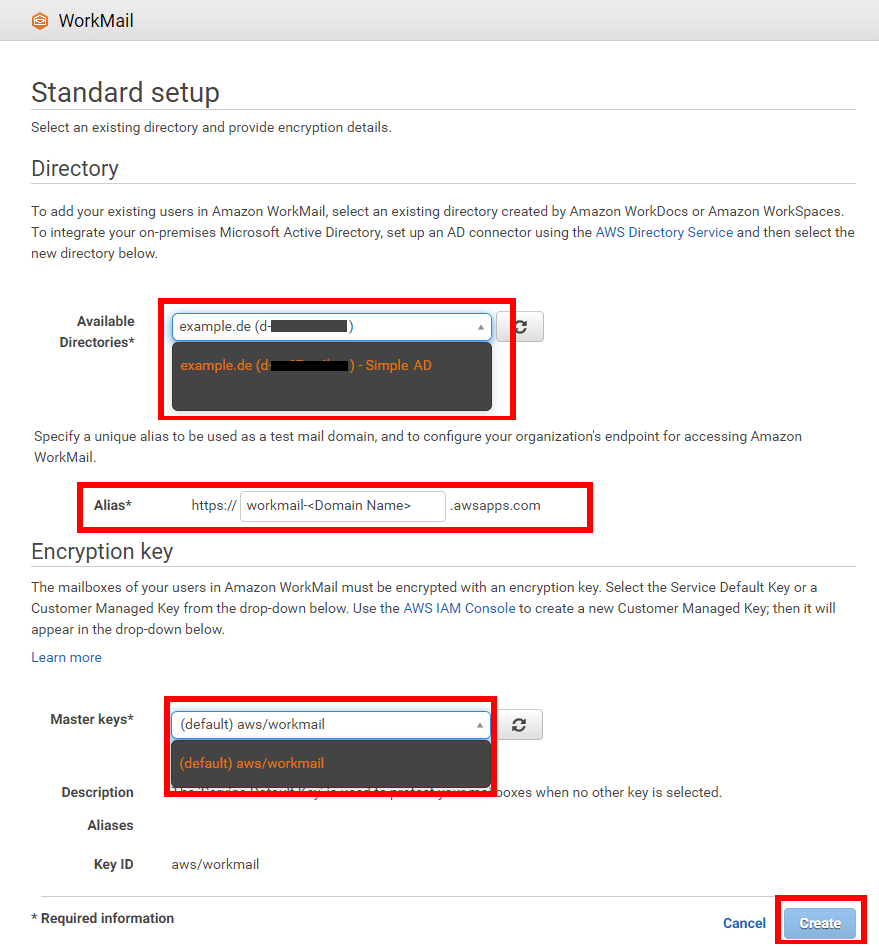 Um ein Postfach zu erstellen, müssen bei AWS zuerst andere Services und Einstellungen konfiguriert werden. Führen Sie die Datei win_create_workmail_directory.bat unter Windows aus. Sie werden aufgefordert, folgende Daten einzugeben: