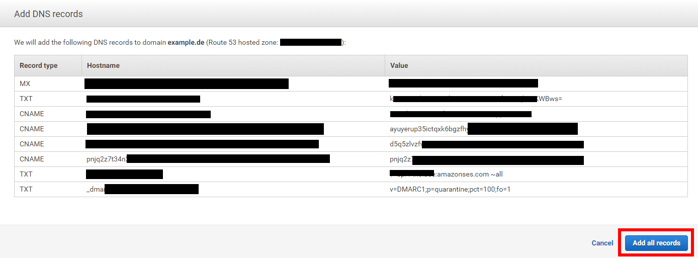 Und noch die automatisierte Erweiterung der DNS-Tabellen seitens AWS mit „Add all records“ bestätigen.