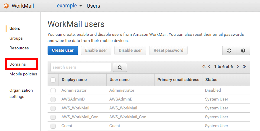 Jetzt müssen Sie noch Ihre Domain-Adresse mit dem Service Workmail verknüpfen. Dafür klicken Sie auf den erstellten Alias, z. B. „example“…