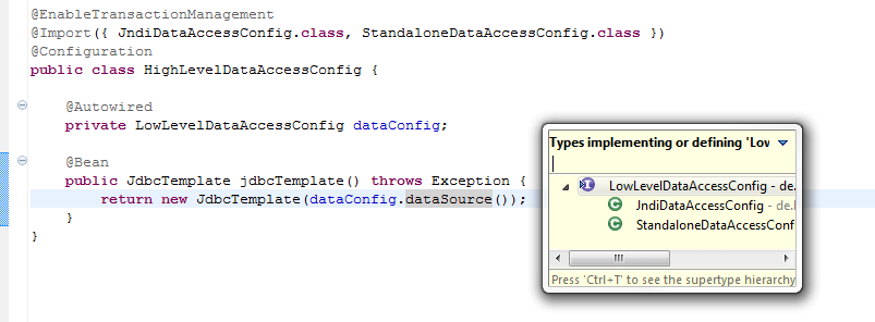 Aus dem ApplicationContext wird eine Konfiguration per Autowiring in die Instanzvariable geladen, die das Interface LowLevelDataAccessConfig implementiert. Es muss genau ein solches Konfigurationsobjekt geben, ansonsten kann der ApplicationContext nicht erzeugt werden. In unserem Fall ist es also entweder die JndiDataAccessConfig bei Aktivierung des Profils websphere, die StandaloneDataAccessConfig bei Aktivierung des Profils standalone oder eine beliebige andere Konfiguration, die LowLevelDataAccessConfig implementiert und dem ApplicationContext hinzugefügt wurde.