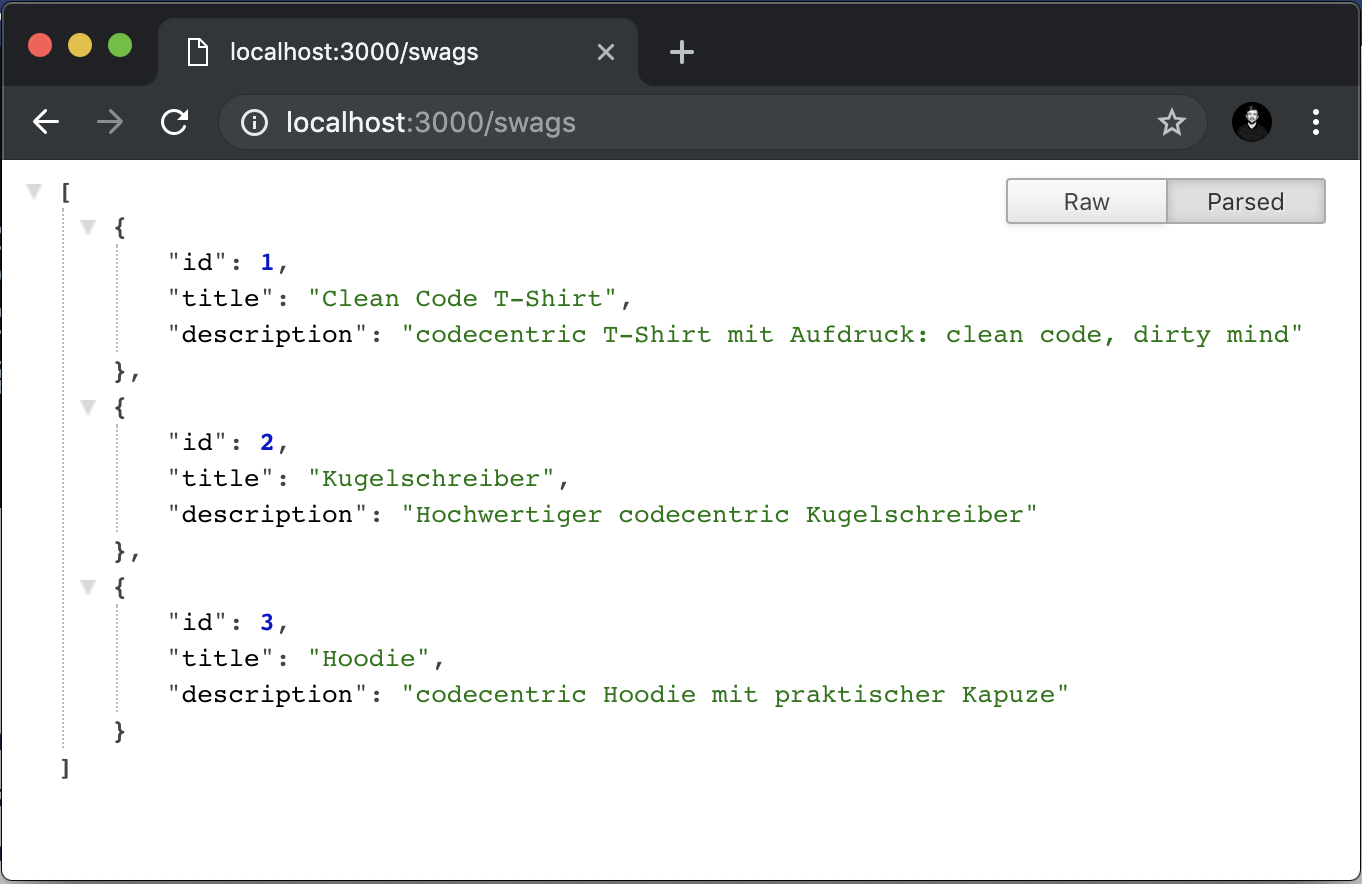Danach ist unser Swag unter http://localhost:3000/swags abrufbar: