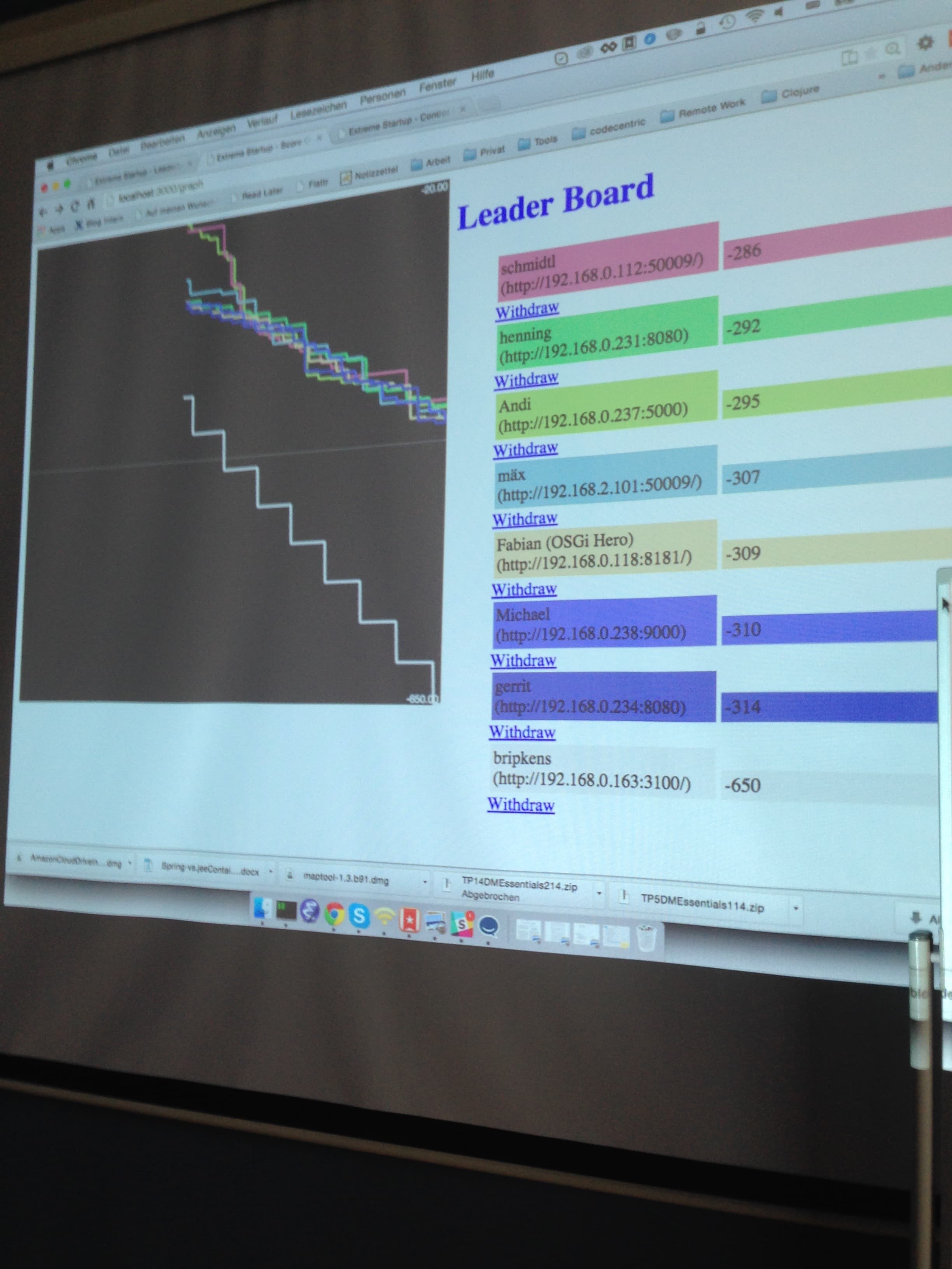 Extreme Startup ist eine kleine Ruby Anwendung. Nachdem der Spielleiter den Spielserver gestartet hat, können sich die Teilnehmer am Spielserver registrieren, indem sie eine URL angeben unter der ihre eigene Anwendung erreichbar ist. Der Spielserver fängt danach an HTTP Requests mit Fragen an die registrierten URLs zu verschicken. Aufgabe der Spieler ist es eine Anwendung zu implementieren, welche in der Lage ist auf die verschiedenen Fragen zu antworten (also eine entsprechende Response mit der richtigen Antwort zurück zu schicken). Jedes mal, wenn auf eine Frage keine oder eine falsche Response folgt, bekommt der betreffende Spieler Minuspunkte. Richtige Antworten geben Pluspunkte. Das alles wird auf einem Leaderboard visualisiert, welches wir mittels Beamer an die Front des Konferenzraums projiziert hatten.