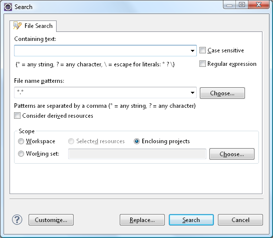 Viele meiner Kollegen und ich nutzen allerdings regelmäßig nur den File Search Tab. Java-Suchen führt man direkt über die entsprechenden Shortcuts wie z.B. Ctrl+Shift+G oder Ctrl+T aus. Die anderen Tabs stören eigentlich nur und verhindern einen schnellen Zugriff auf den File Search Tab über einen Shortcut.
