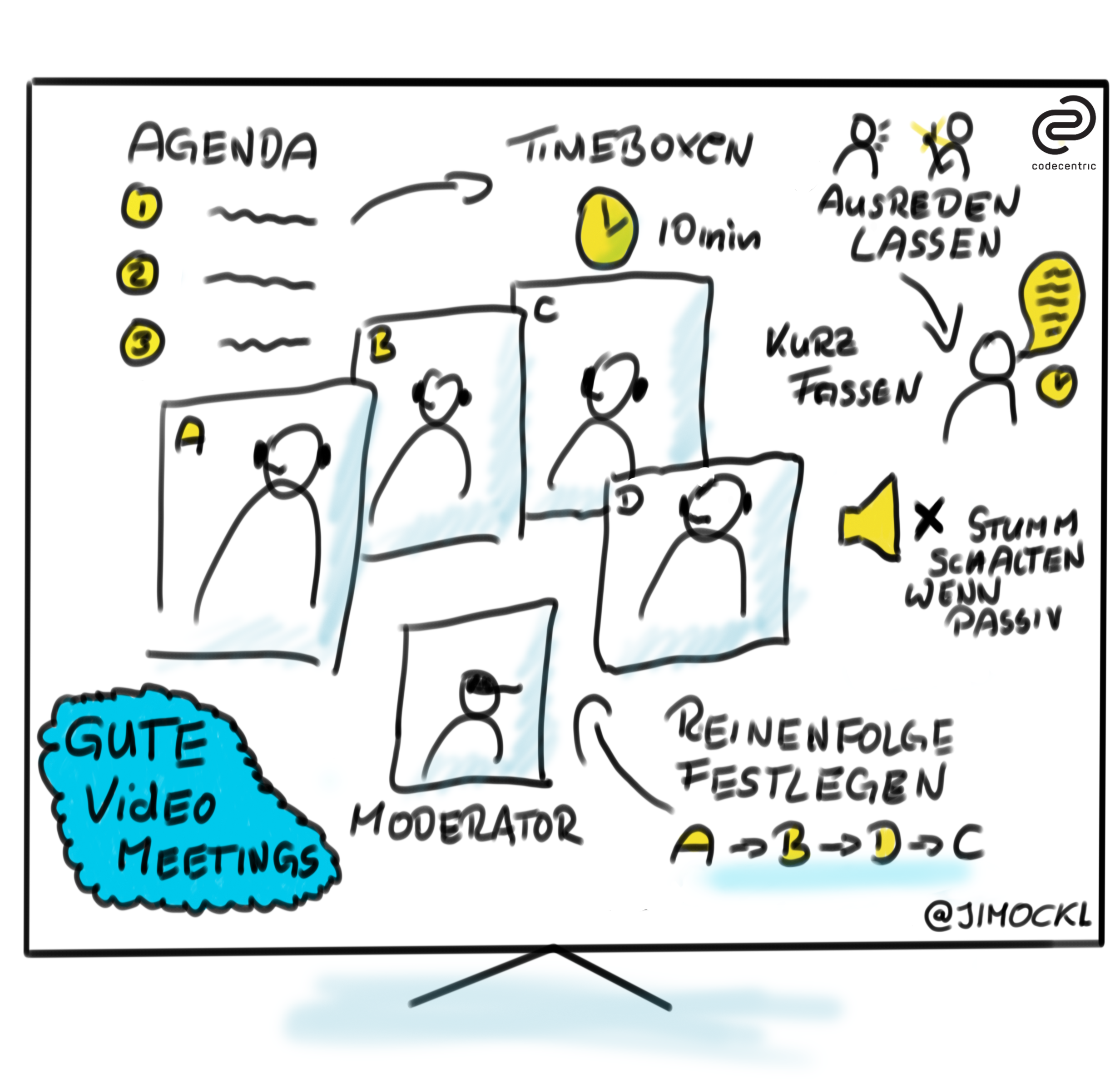 - Bei schwierigen Diskussionen oder vielen Teilnehmer*innen, die im Home Office sind, braucht es ein*e Moderator*in