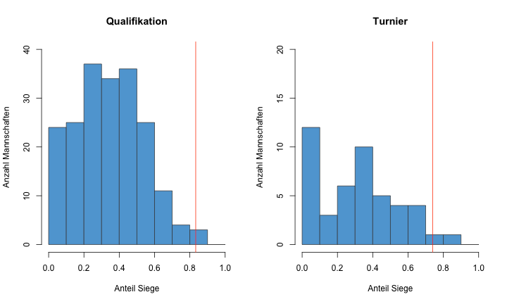 1valueGermanyQualification <- t(qualificationTeamResults[qualificationTeamResults[, 2 1] == "Germany", ])[1, 4] 3valueGermanyTournament <- t(tournamentTeamResults[tournamentTeamResults[, 1] == 4 "Germany", ])[1, 4] 5 6par(mfcol = c(1, 2)) 7hist(unlist(qualificationTeamResults[, 4]), ylim = c(0, 40), xlab = "Anteil Siege", 8 ylab = "Anzahl Mannschaften", main = "Qualifikation", col = "steelblue3", 9 border = "grey20", breaks = c(0, 0.1, 0.2, 0.3, 0.4, 0.5, 0.6, 0.7, 0.8, 10 0.9, 1)) 11abline(v = valueGermanyQualification, col = "red") 12hist(unlist(tournamentTeamResults[, 4]), ylim = c(0, 20), xlab = "Anteil Siege", 13 ylab = "Anzahl Mannschaften", main = "Turnier", col = "steelblue3", border = "grey20", 14 breaks = c(0, 0.1, 0.2, 0.3, 0.4, 0.5, 0.6, 0.7, 0.8, 0.9, 1)) 15abline(v = valueGermanyTournament, col = "red")