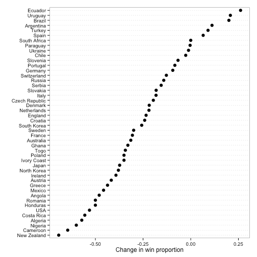 1changeWinProportion <- apply(tournamentTeamResults,c(1),function(row) { 2 teamName <- unlist(row[1]) 3 qualificationRowNumber <- which(qualificationTeamResults[,1]==teamName) 4 qualificationRow <- qualificationTeamResults[qualificationRowNumber,] 5 winProportionChange <- unlist(row[4]) - unlist(qualificationRow[4]) 6 return (c(teamName,winProportionChange)) 7 } 8) 9 10changeWinProportion <- t(changeWinProportion[,order(as.numeric(changeWinProportion[2,]),decreasing=TRUE)]) 11 12changeWinProportionDF <- data.frame(changeWinProportion[,1],as.numeric(changeWinProportion[,2]),stringsAsFactors=FALSE) 13names(changeWinProportionDF) <- c("Names","Change") 14 15ggplot(changeWinProportionDF, aes(x=Change, y=reorder(Names, Change))) + 16 geom_point(size=3) + # Use a larger dot 17 theme_bw() + 18 xlab("Change in win proportion") + 19 ylab("") + 20 theme(panel.grid.major.x = element_blank(), 21 panel.grid.minor.x = element_blank(), 22 panel.grid.major.y = element_line(colour="grey60", linetype="dotted"))