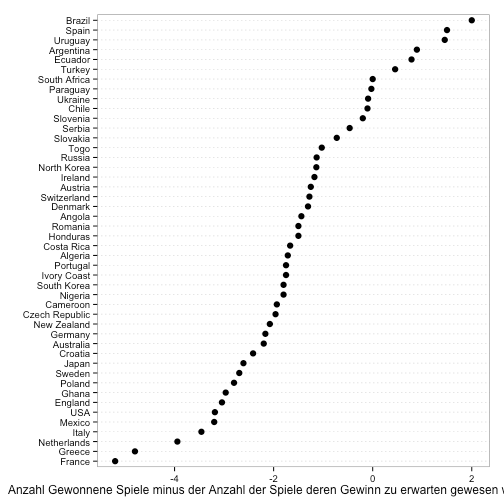 Nun ist das aber vielleicht auch unfair, weil Mannschaften die nur an wenigen Turnieren teilgenommen haben hier schnell einen höheren Wert haben als die Mannschaften die an vielen Turnieren teilgenommen haben. Um das zu korrigieren können wir auf die absoluten Zahlen schauen; aus dem Anteil der Siege in der Qualifikation bestimmen wir die erwartete Anzahl der Siege im Turnier (ohne Berücksichtigung der Stärke der Mannschaften) und betrachten dann die absolute Abweichung, d.h. die Anzahl der Spiele die mehr oder weniger gewonnen wurden.