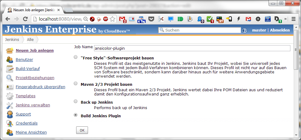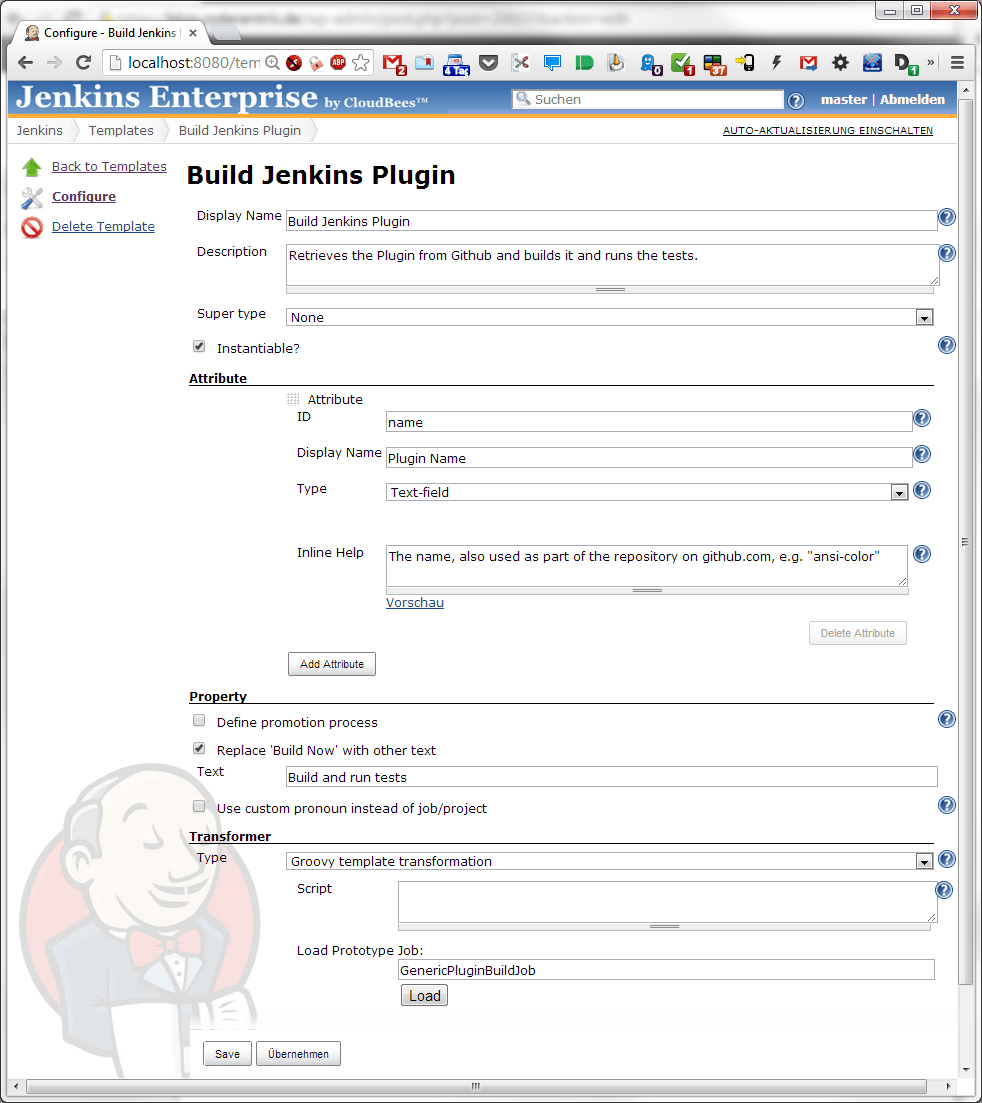 - Zuerst legt man sich wie üblich einen „Beispiel Job“ (hier: GenericPluginBuildJob) an, den man später natürlich „deaktiviert“, damit er nicht irrtümlich gestartet wird.