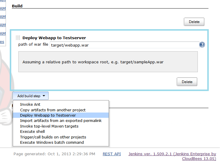 Dieser einfache Beispiel Build Step soll eine Web Applikation unter Windows zu einem Tomcat Server deployen. Wir benötigen dazu nur den Dateipfad zur war Datei