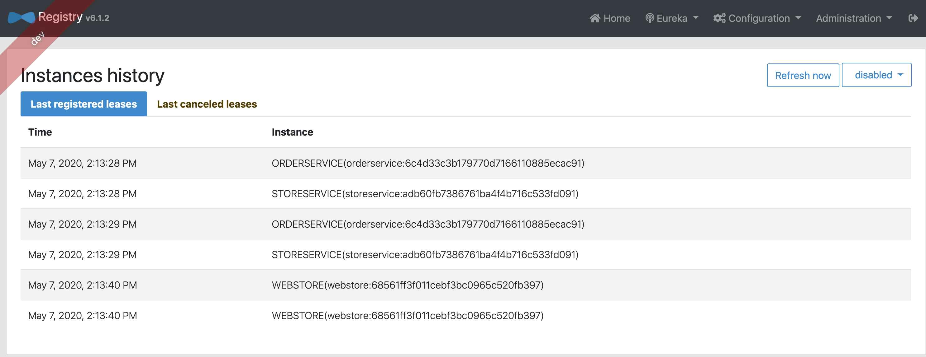 What drives microservices developers the most is statistics about how the services behave, how healthy they are, and how one can easily implement malfunction analysis. With JHipster you are not left alone. The administrative menu shows some functions that must not be missing in any professional system. But in case your application won’t start would you lose this information? No – you have JHipster-Registry (already started with Docker) which provides the same information in an independent service. The default port for the registry is 8761.