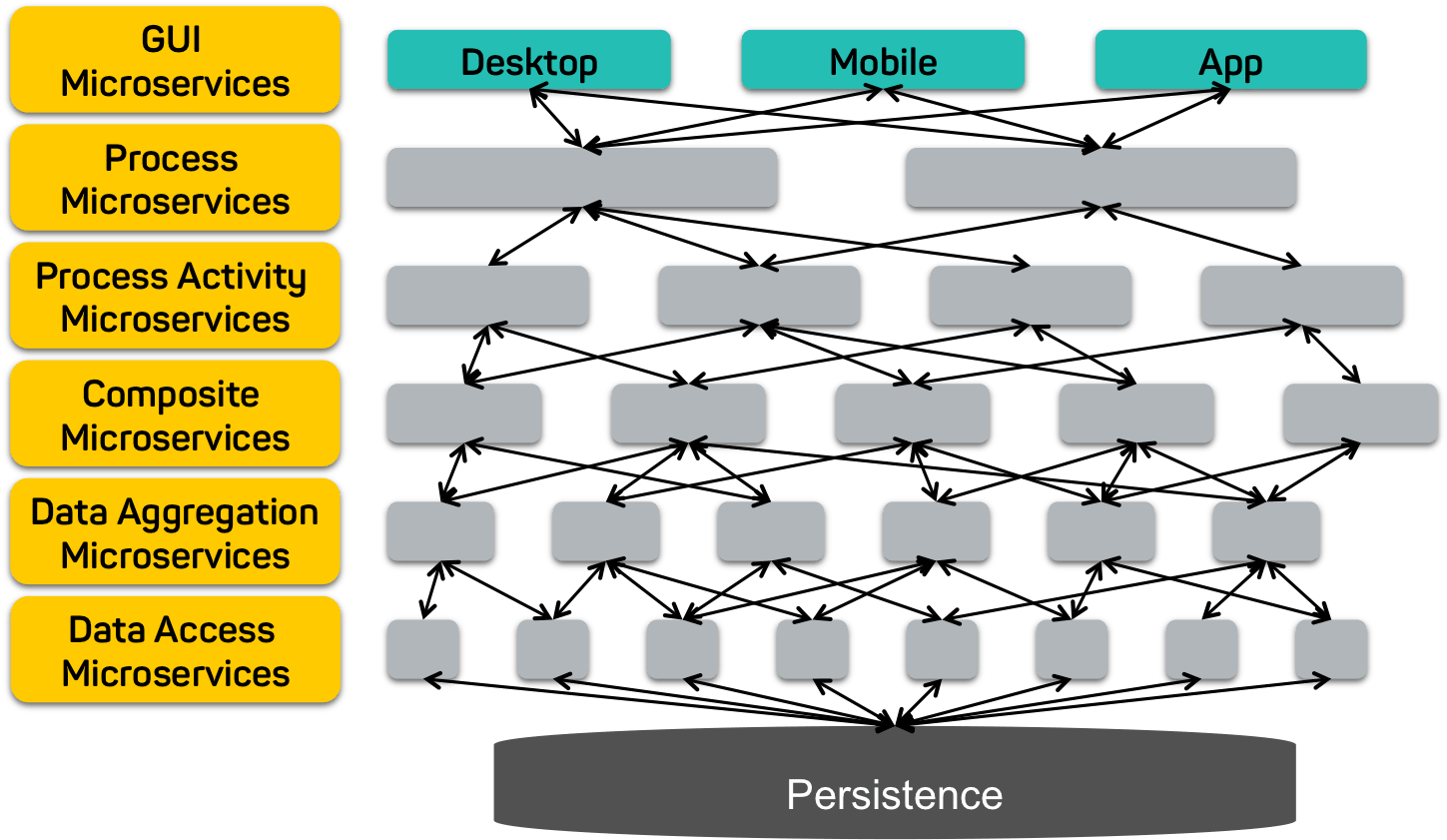 Ich gehe davon aus, dass wir von Full-Stack-Microservices reden, die Persistenz und Fachlogik für einen bestimmten Bounded Context beinhalten. Vor kurzem bin ich mal wieder über eine Folie gestolpert, in der der Autor wie in der folgenden Grafik diverse Schichten aufgezeichnet hatte.