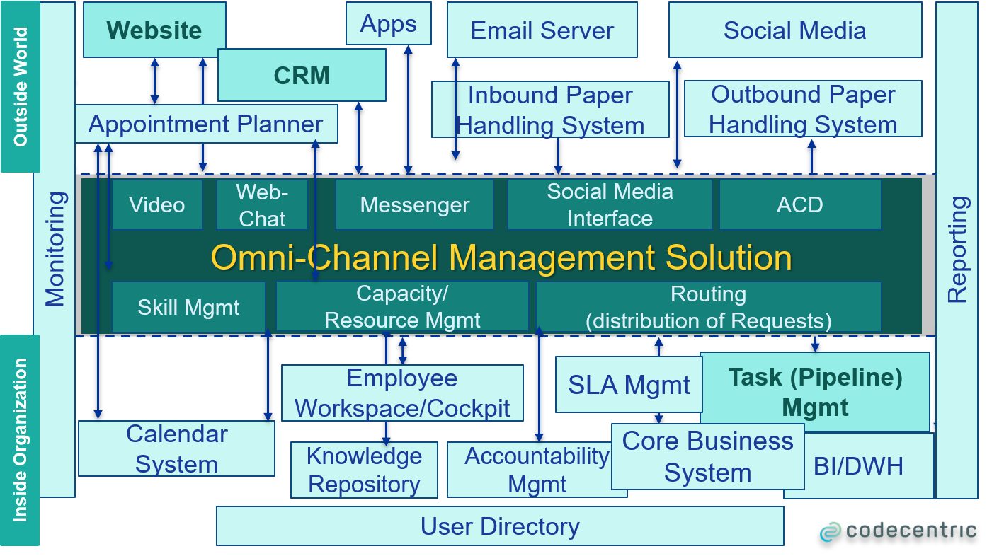 Viele Funktionalitäten können von bestehenden Systemen auf die eine oder andere Weise angeboten werden. Dazu gehören Video-Chat, Terminmanagement, Personal- und Kapazitätsplanung, Kompetenzmanagement, Weiterleitung und Zuweisung von Anfragen (Routing), Berichterstattung, Überwachung und Pipeline (Aufgabenmanagement). Jeder dieser Bereiche kann eine (interne) Out-of-the-box-Funktion einer Omni-Channel-Plattform sein, oder er kann jeweils in einem separaten System behandelt werden, das entsprechend in die bestehende Plattform integriert werden sollte. Beispielsweise kann ein Terminverwaltungssystem, das von der Verkaufsabteilung verwendet wird, ein anderes sein als das, das die Systemagenten oder der Second-Level-Support zur Verwaltung von Terminen verwenden. Diese Redundanzen müssen bei Bedarf behoben werden, was den Umfang des Omni-Channel-Programms erweitern kann.