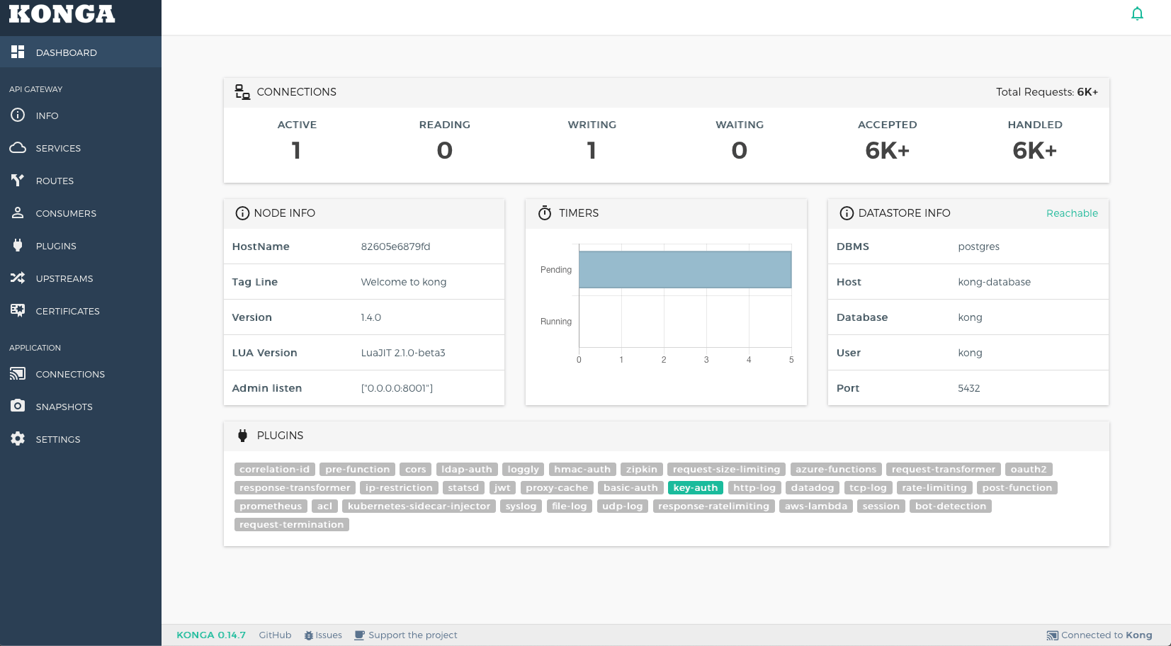 Seit dem letzten Post ist eine neue Version (1.4 ) des Kong API Gateways veröffentlicht worden. Die größte Neuerung stellt die /status-Route dar. Über diese lässt sich der Status eines Gateways direkt abfragen. Anfang Dezember ist auch ein Patch-Release (1.4.1 ) erschienen.