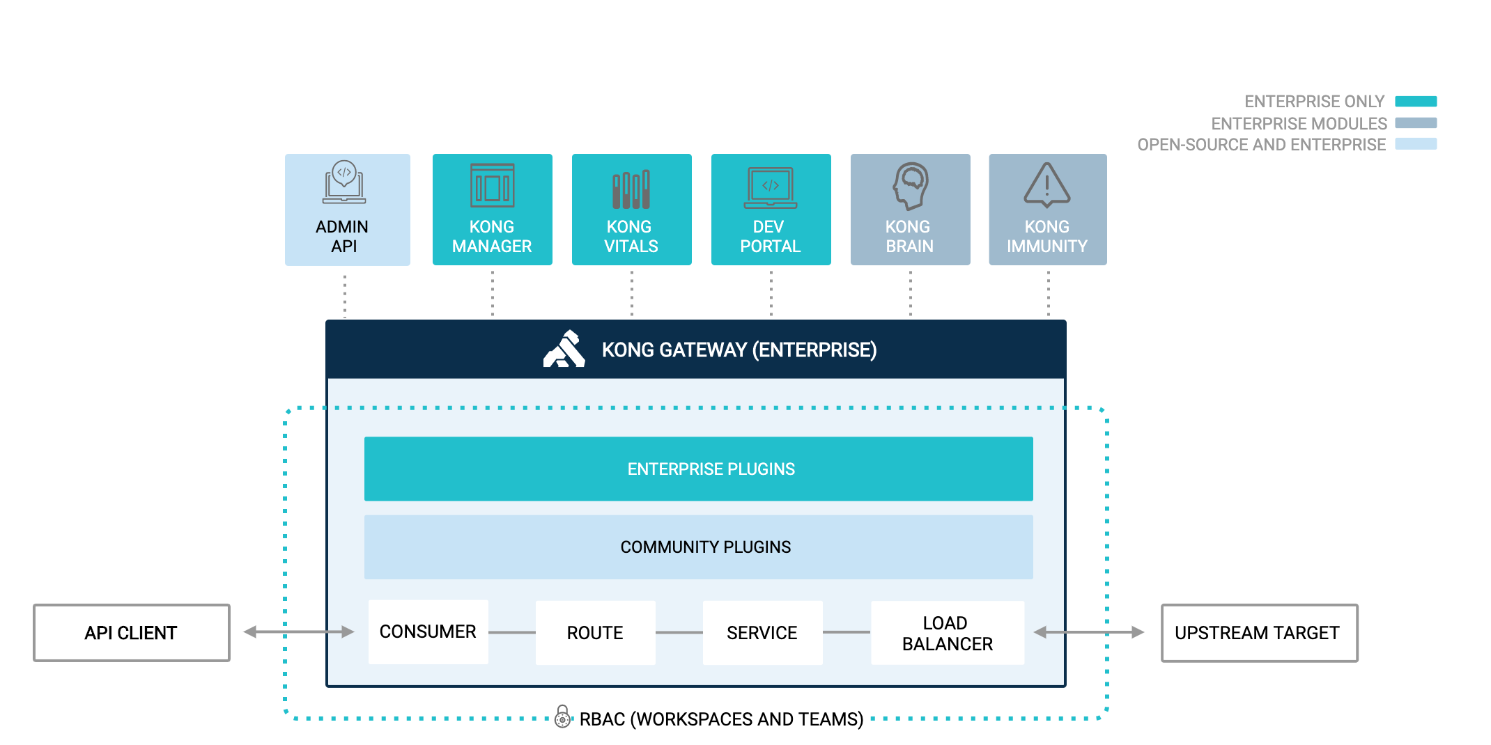 Das Produkt besteht aus mehreren Komponenten, denen ich mich in einer neuen Blogpost-Serie nun widmen möchte. Die erste Komponente ist uns schon aus den bisherigen Blogposts bekannt: das Gateway. Es wird aktuell (Ende Mai 2020) bei Kong Enterprise mit der Versionsnummer 1.5 ausgeliefert. Hier zeigt sich ein großer Unterschied zum Open-Source-Produkt, welches schon seit März 2020 in der Version 2.0 verfügbar ist, und zeigt zugleich, wie wichtig Kong als Hersteller das Enterprise-Produkt ist, da neue Features des Open-Source-Produktes erst eine gewisse Reife erhalten, bevor diese dann ein Teil des Enterprise-Produktes werden. Die folgende Grafik stellt die einzelnen Komponenten schematisch dar.