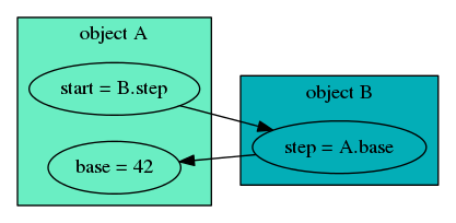 Der Wert von A.start ist abhängig von B.step, welcher von A.base abhängt. Wichtig: hier ist keine zyklische Beziehung vorhanden ist, trotzdem führt die Ausführung des obigen Szenarios via Scala REPL zu einem Deadlock (sollte es zufällig beim ersten Mal funktionieren, einfach noch einmal probieren):