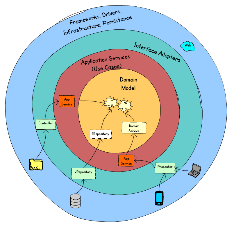 Das heißt der Kern, das Domain Model, ist nicht von den Applikationsregeln oder Use Cases, dieser nicht von Interfaces zu Controllern oder Gateways und der nicht von Treibern, Datenbanken oder UIs abhängig.
