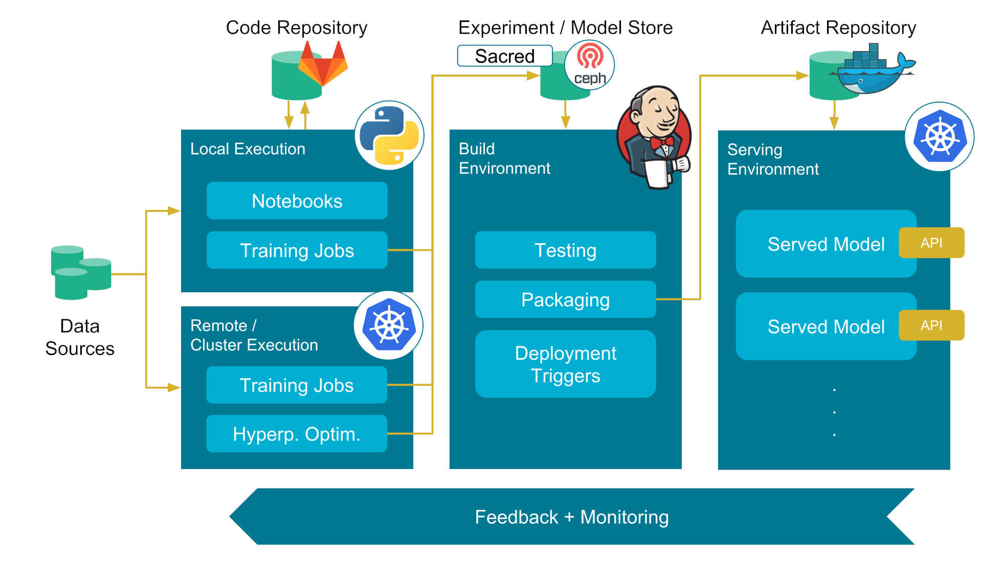 Each model project has its own repository in a self-hosted GitLab. Since we decided that all models will be created using Python, we have a convention that the repository has to contain a Pipfile (created using pipenv ) describing the desired Python environment. Our data scientists work on the model code by experimenting using Jupyter notebooks and running training jobs locally. The training jobs use Sacred to write information about each training run (Git hash, parameters, metrics, etc.) into a MongoDB database. The resulting model gets transferred to a central Ceph file store and referenced in Sacred’s run information. The experiments can be searched and compared via the web interface of a hosted Omniboard instance. Remote execution highly depends on the framework, but we have a GPU-enabled Kubernetes cluster that can be used for accelerated and distributed training.