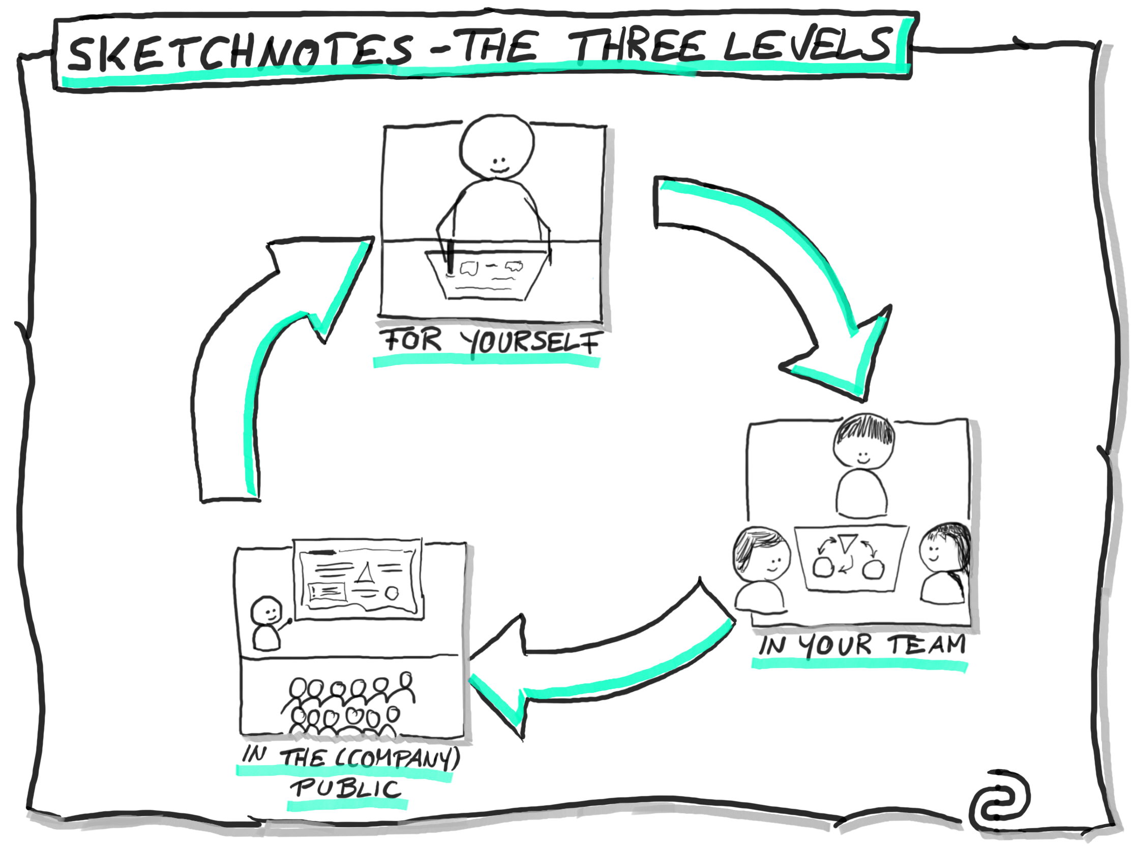 Sketchnotes sind Notizen, die aus Text, Bild und Strukturen bestehen. Der Prozess der Sketchnote-Erstellung wird „sketchnoting“ genannt. Häufig werden Sketchnotes als Alternative zur konventionellen Mitschrift angefertigt. Im Gegensatz zu Texten sind Sketchnotes nur selten linear strukturiert. Die Visualisierung durch Sketchnotes ermöglicht es, komplexe Sachverhalte wesentlich schneller zu erfassen.Sketchnotes sind gerade zur Visualisierung im beruflichen Umfeld sehr gut geeignet. Im Prinzip gibt es drei Ebenen zum Einsatz: Jeder kann für sich selbst Sketchnotes nutzen, um Notizen zu machen und Zusammenhänge zu skizzieren.