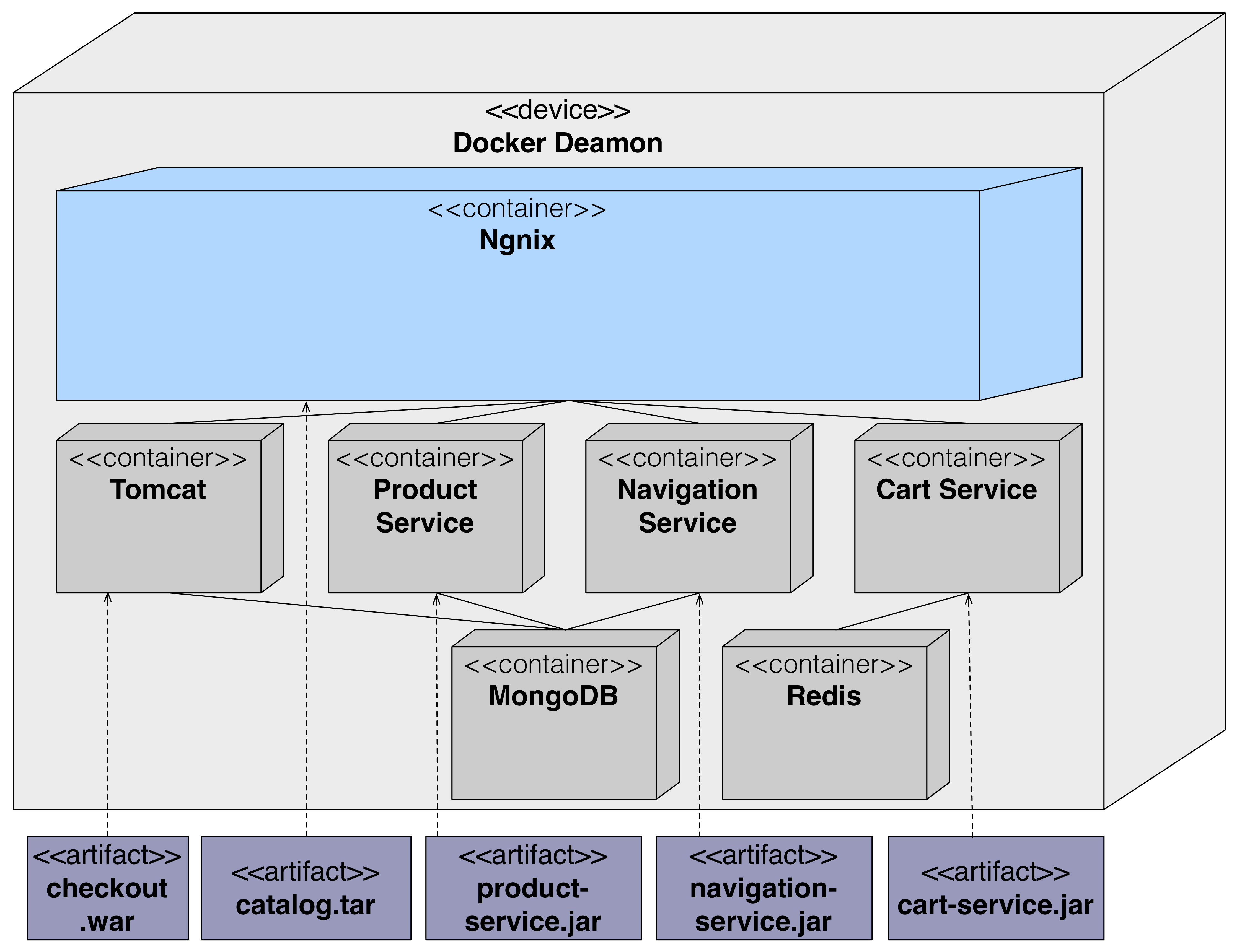 Wie man durch das vorherige Listing sieht, sind schon zum Erstellen von einfachen Anwendungen mehrere Kommandos nötig. Das folgende Verteilungsdiagramm lässt erahnen, wie kompliziert das Ganze mit einer wachsenden Zahl von Microservices wird. Es wäre doch schön, wenn man eine Möglichkeit hätte, um solche komplexen Deployment-Szenarien zu beschreiben.