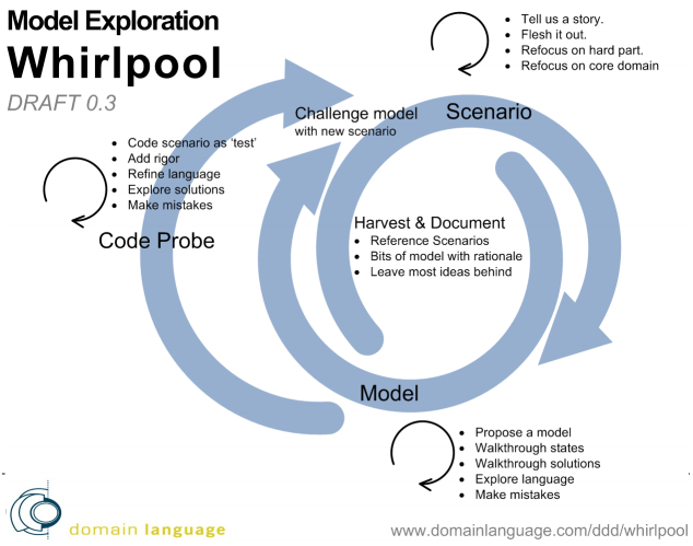 Wie beim ständigen Verfeinern der Anforderungen im Produktmanagement werden Modelle und Kontexte in DDD ständig hinterfragt und verfeinert, umgebaut oder sogar entfernt. Dies ist ebenfalls ein kontinuierlicher Prozess. Evans nennt dies „Model Exploration Whirlpool“: